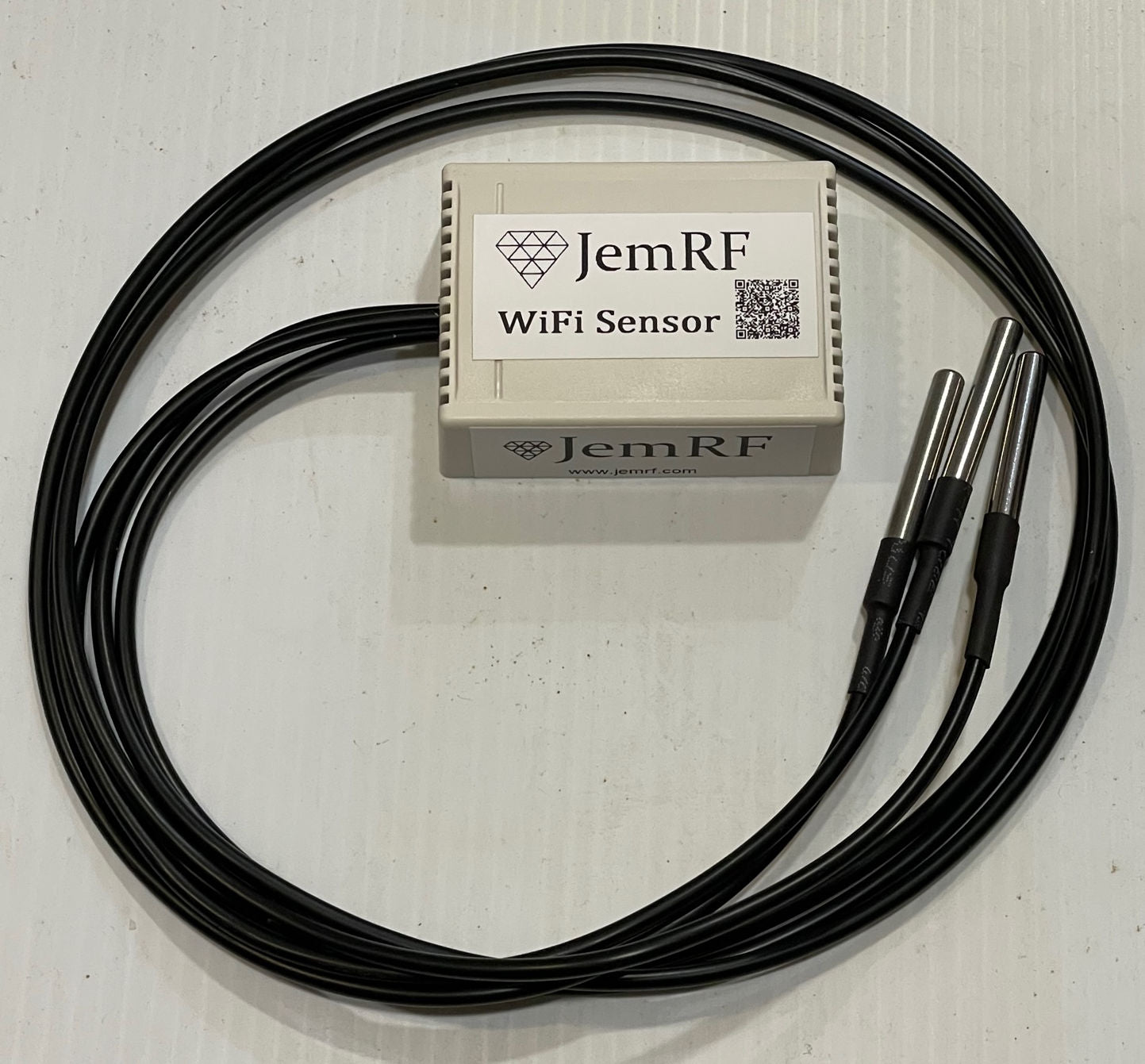 This Wi-Fi-enabled device connects directly to your WIFI router so you can send temperature readings to Monitoring.JemRF.com or another monitoring application. It is fully assembled and requires no soldering. Connect it to power, and it will advertise itself as a wireless access point. Configure it through a web browser using its easy-to-use config application. Once configured, it will connect to your Wi-Fi network, giving it access to the internet and to JemRF or other servers. Has an extended antenna installed for better WiFi connections. Multiple MQTT data formats, including a Home Assistant-compatible format.